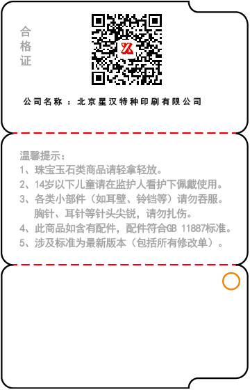防偽吊牌是承載飾品商標(biāo)的有效載體,現(xiàn)在許多大型企業(yè)為了維護(hù)自己的品牌權(quán)益都制作了專(zhuān)屬于自己的防偽標(biāo)識(shí),標(biāo)識(shí)上有一些廠(chǎng)家資料的簡(jiǎn)單介紹,如廠(chǎng)家名稱(chēng)、產(chǎn)品名稱(chēng)、規(guī)格型號(hào)、產(chǎn)品等級(jí)、儲(chǔ)藏方法、檢驗(yàn)合格證明等。珠寶商家也是一樣,一般在珠寶吊牌上也都會(huì)標(biāo)注這些基本信息,好讓消費(fèi)者可以更好的了解商家信息。